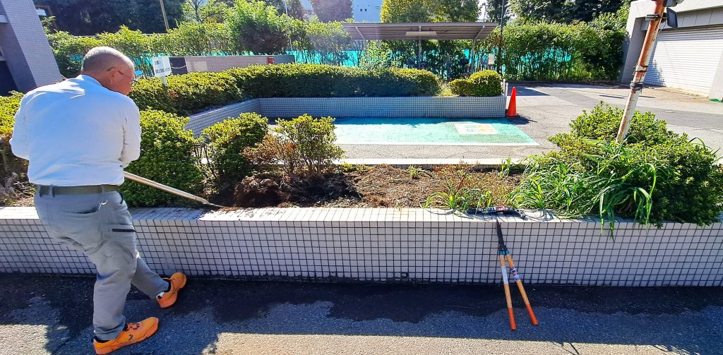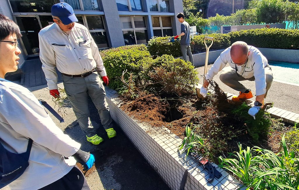 前回 枯木を抜いて空間のできた植え込みに、別の場所から低木を移植する作業をおこないました。