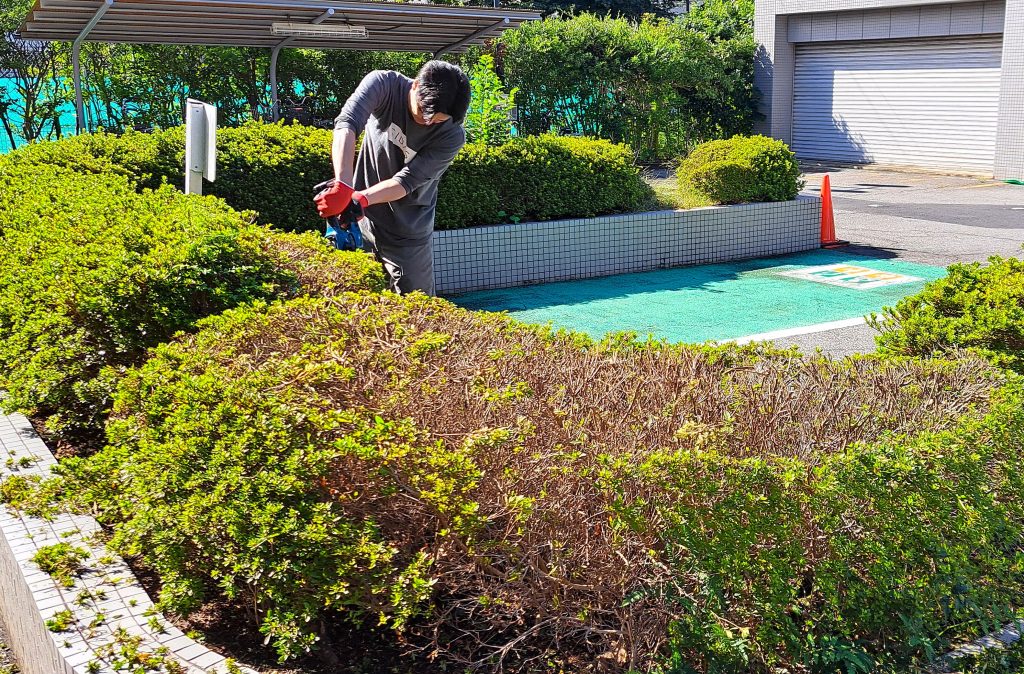 そして 10月にしては日の光が強く差し込む中、同所にて 他の生垣の剪定も行われました。